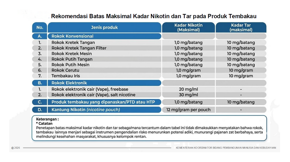 Sebagai langkah awal dalam tahapan teknis, telah diterbitkan Keputusan Menteri Koordinator Bidang Pembangunan Manusia dan Kebudayaan (Kepmenko PMK) Nomor 29 Tahun 2025 tentang Tim Kajian Penentuan Batas Maksimal Kadar Nikotin dan Tar.