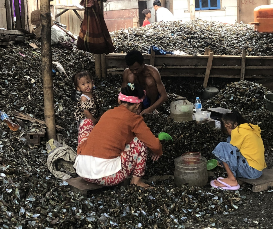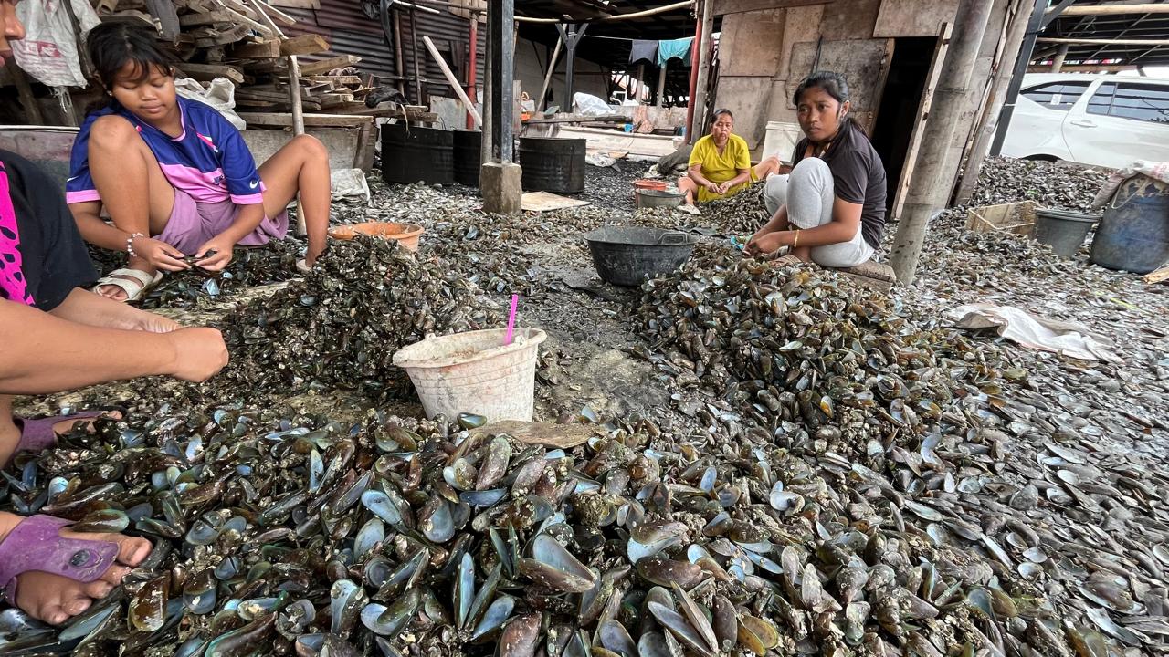 Kampung Empang memang dikenal sebagai pusat perebusan kerang hijau. Mayoritas perempuan yang tinggal di sini bekerja dengan mengupas kerang. Penghasilan keluarga Darnia tak pernah pasti. Dia mengupas kerang dengan upah Rp35 ribu per drum.
