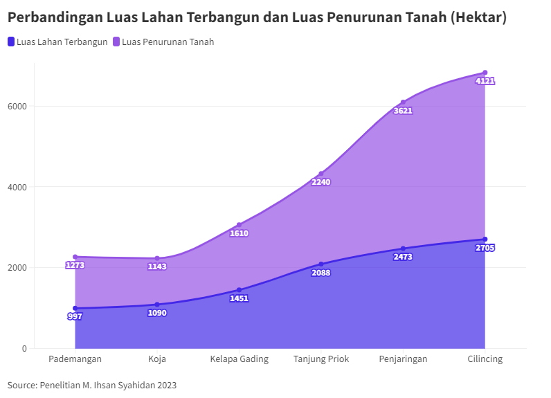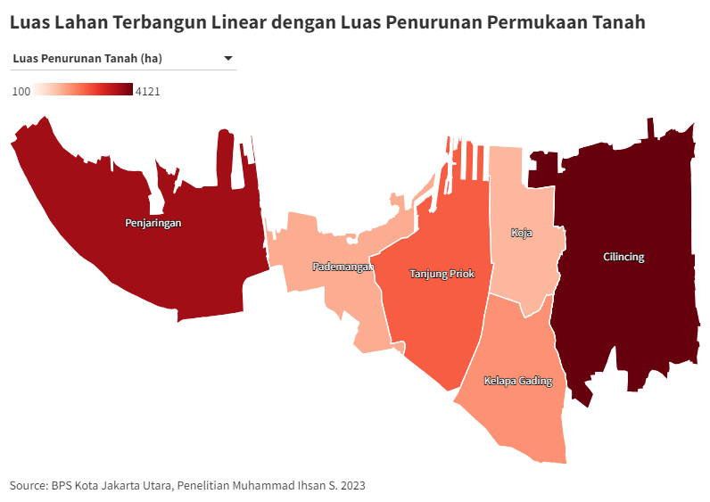 Penelitian Muhammad Ihsan Syahidan (UIN Jakarta) dan Emeralda Amirul Ariefa, Yudo Prasetyo, dan Andri Suprayogi mencatat, lahan terbangun di Jakarta Utara meningkat ratusan hektare dalam satu dekade terakhir-–menjadikannya penurunan muka tanah paling parah di Jakarta.